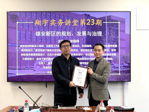 院长吴晓林为张丽伟颁赠“翔宇实务讲堂第二十三期”主讲纪念奖牌。