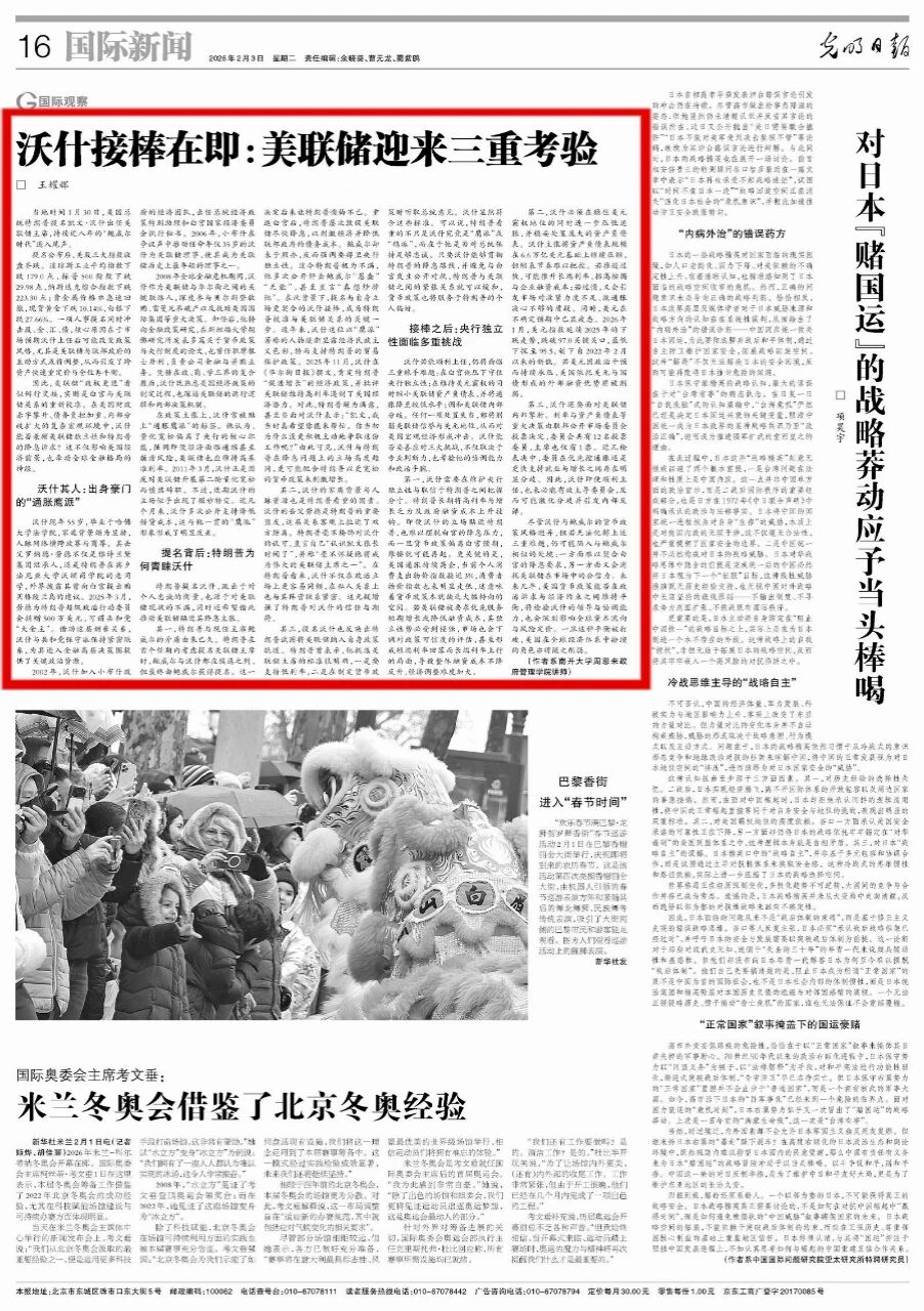 沃什若能顺利上任,仍将面临三重棘手难题:在白宫施压下守住央行独立性;在维持美元霸权的同时缩小美联储资产负债表,并将通胀降至较低水平;调和美联储内部分歧。任何一项处置失当,都将削弱美联储信誉与美元地位,从而对美国宏观经济形成冲击。沃什能否妥善应对三大挑战,不仅取决于专业判断力,也考验他的协调能力和政治手腕。