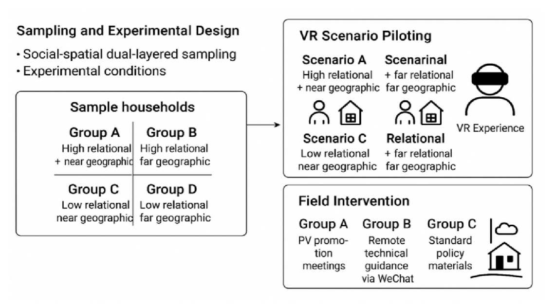 为识别相关作用路径,研究采用“实验—调查”结合的多方法设计:一方面,通过沉浸式VR情境实验,对亲缘与地缘因素进行可控操纵,识别其对农户决策的因果影响;另一方面,基于天津市蓟州区2240户农户样本,开展“血缘—空间”因子实验,模拟不同社会关系情境下的信息传播与行为响应过程(图2),系统检验农村光伏扩散的社会机制。