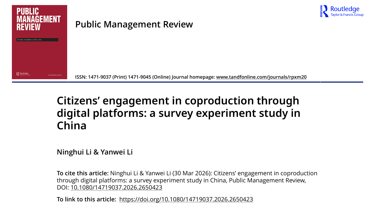 李延伟教授(通讯作者)合作的学术论文“Citizens’engagement in coproduction through digital platforms: A Survey Experiment Study in China”,被公共管理领域国际顶级期刊Public Management Review(PMR)接收并在线发表。PMR由 Taylor & Francis出版,是国际公共管理研究学会旗舰刊物,办刊宗旨是推进公共管理领域的理论和经验研究。PMR期刊在公共管理类别中位于Q1区,为公共管理领域影响力最高的期刊之一。