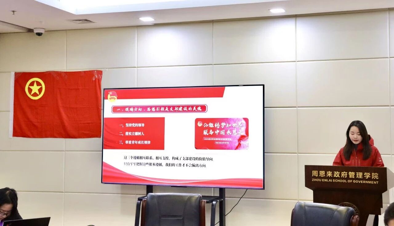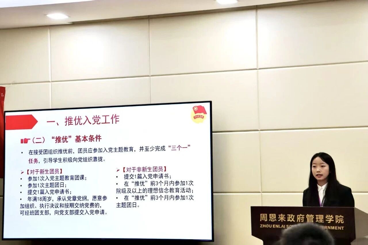 组织部同时也邀请了2023级国际政治专业班级团支书袁语浩作为团支书代表,聚焦五四评优,分享了其特色团支部的建设心得。 她在工作中不断精益求精,总结出“明确方向、深挖特色、实践为基、打造品牌”的16字团务工作经验,为各位团支书建设支部提供了借鉴。