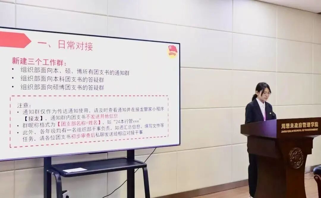 院团委组织部组织建设中心负责人渠成洋详细介绍了本学期团组织建设工作,将日常对接、系统操作、团代会开展详情,团小组评优流程等重要工作任务以认真严谨的态度做出传达。她表示,组织建设中心将与各团支书一同结合专业特色,联手打造建设品牌,共同打造具有周政特色的团务队伍。